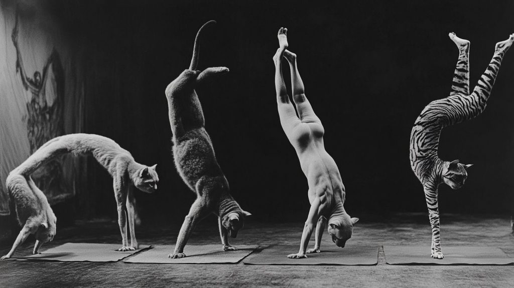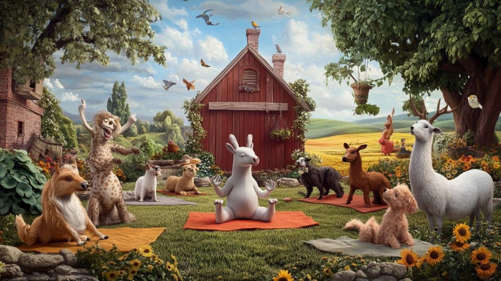 Die nach unten schauenden Hunde, die nach dem Brett, auf Brücken und Pflug, die Katzen sowie die Kühe jagen. Frösche waren auch darunter.