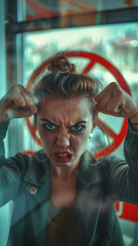 Sie blieb abrupt vor dem Eingang stehen, ging jedoch nicht weiter hinein, sondern hub an mit Schimpf. Unverständlichem Wort-Tetris der zur akustischen Herausforderung anschwoll. Dann ging sie den Weg ein Stück zurück, nahm kurz Anlauf, rannte gegen die geschlossene Tür des Geschäfts und schlug mit beiden Händen auf die rot-weißen Klebeschilder ein. Begleitet wurde ihr Tun erneut mit fortlaufendem Sound von Beschimpfungen.